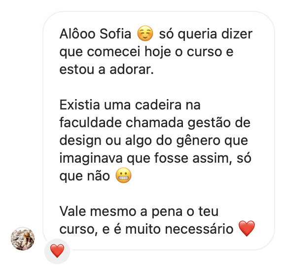 "Foi, sem dúvida, uma excelente ajuda. Muitas das questões que falaste e sugeriste foram exatamente ao encontro do que não domino tão bem hoje (mas quero dominar cada vez melhor!). Consegues de uma forma sucinta, organizada e direta explicar as várias dimensões e desafios que vamos ter que lidar enquanto freelancers."