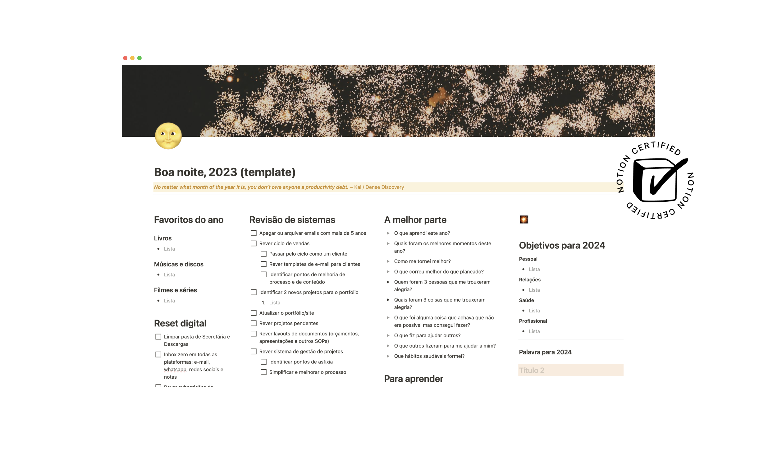 O template de revisão anual para o Notion, para reveres o teu ano de 2023 e preparares 2024.